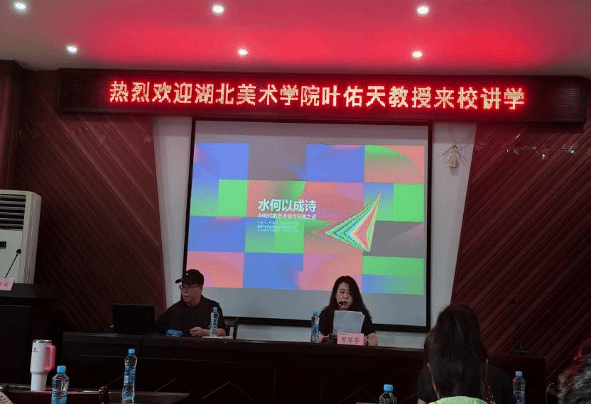 10月17日,湖北美术学院教授、博士生导师叶佑天应邀做客我院学术讲坛,在艺术楼A230 为我院师生作了一场题为“水何以成诗?AI时代的艺术创作突围之道”的讲座,讲座由人文与艺术学院院长万芬芬主持,100余名师生参加了讲座。