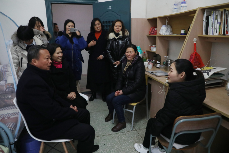 2019年1月7日下午,校党委副书记张立青,学生工作处处长胡盛华,学生资助管理中心主任高丽明,学院党委副书记王锐以及辅导员、班主任深入学生宿舍走访慰问家庭经济困难学生吴虹及吴虹陪读家长,为吴虹同学送上慰问金。