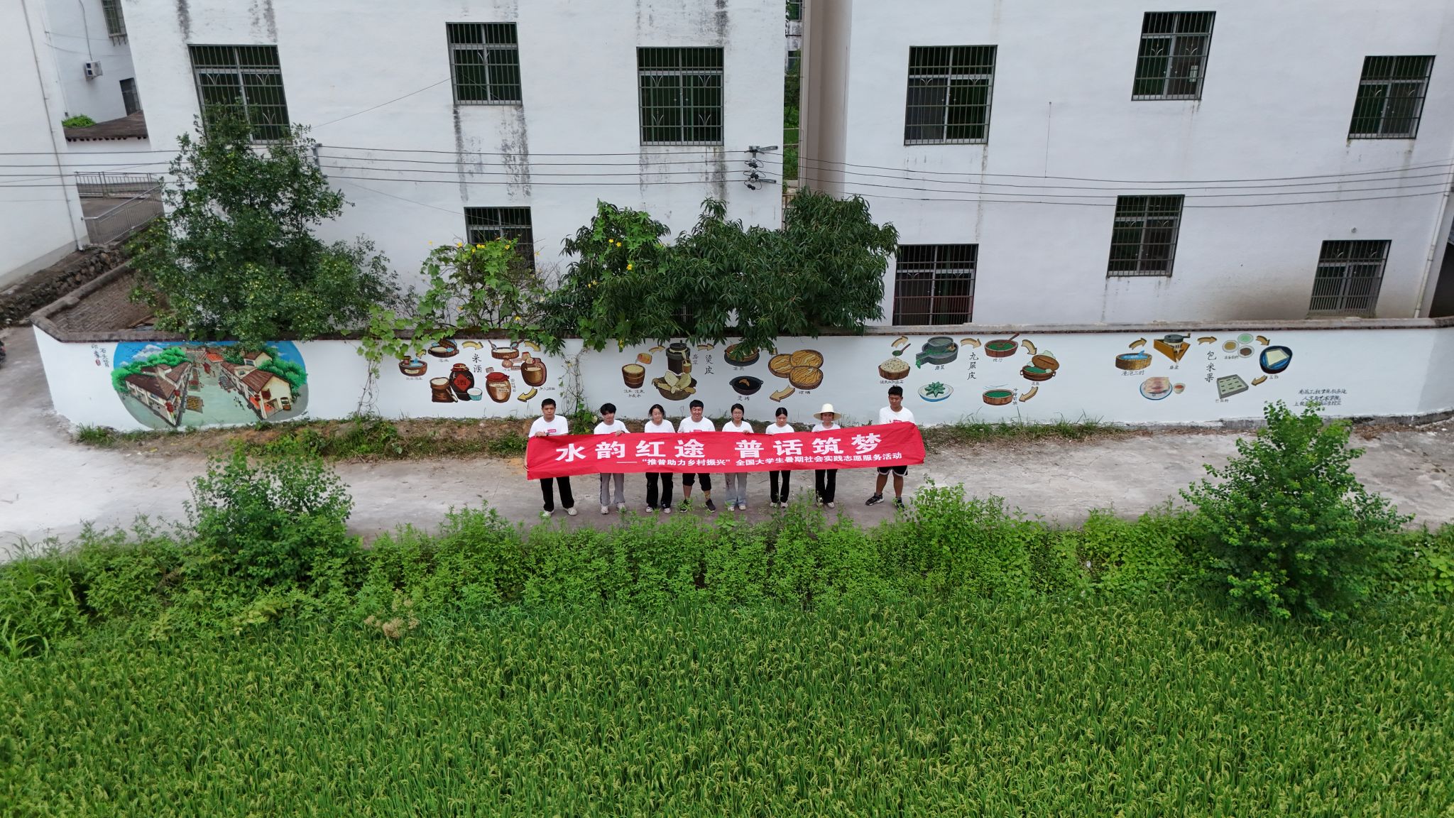 实践团成员通过挖掘石崇村独特风情与故事,提炼精髓融入设计,反复推敲,力求每一线条、每抹色彩都能精准传达地域特色。至绘画阶段,以笔为舟,以墨为帆,在空白的墙面上绘制。面对长时间的体力消耗和炎热的天气,然而每当想起原本单调的墙壁在他们的笔下焕发出新的生命力,那份成就感便足以驱散所有的疲惫与困难。