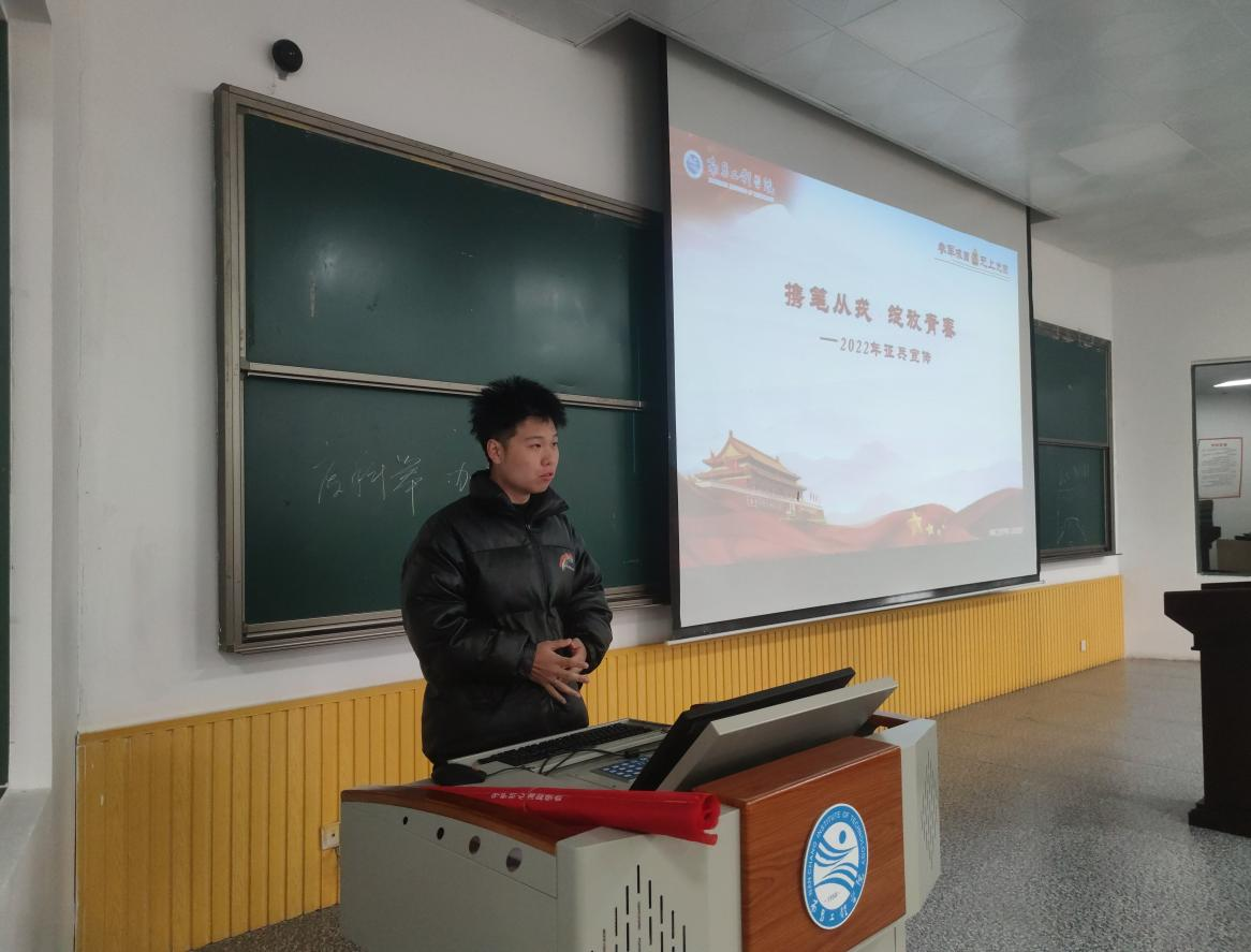 为助力征兵宣传,鼓励我院同学积极应征入伍,激发学院学生报效祖国的热情,帮助学生了解参军入伍相关政策,人文与艺术学院于11月29日在教学南大楼C105开展了榜样的力量之“携笔从戎,绽放青春”2022届毕业生征兵宣传会,出席此次活动的有人文与艺术学院团委副书记丁蓓蒂、退伍军人代表付润堃,全体学生干部及有意向入伍的学生参加。