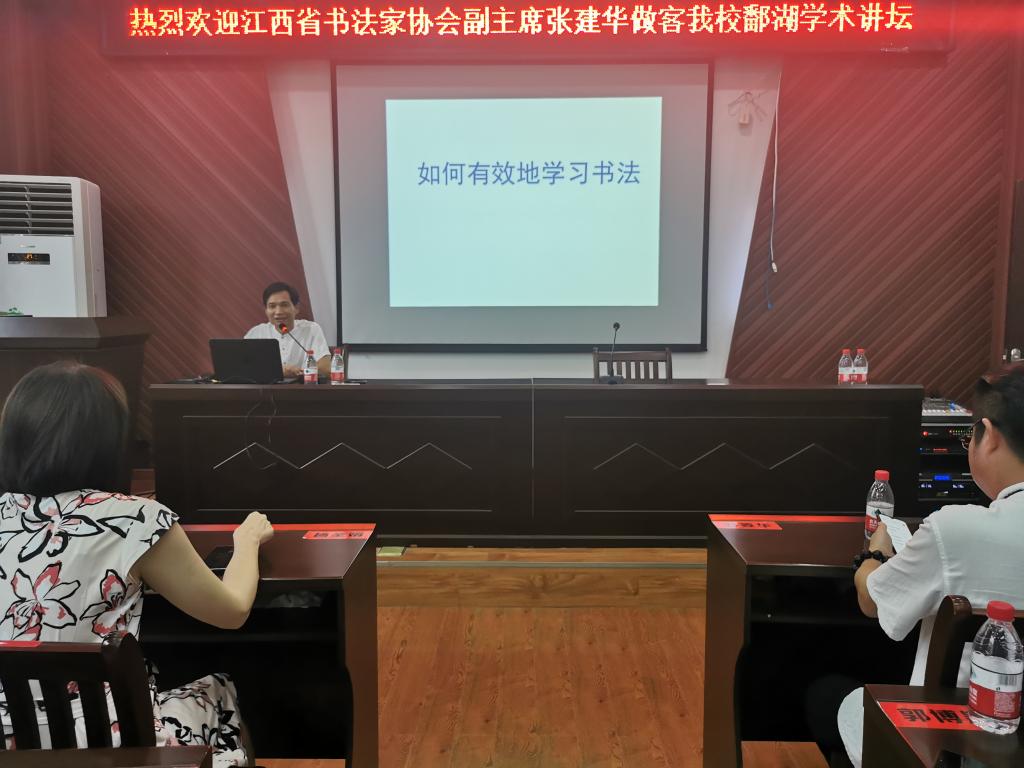 625日,江西书法家协会副主席张建华应我校邀请做客“鄱湖学术讲坛”,在艺术楼A230会议室作了一场主题为“如何有效地学习书法”的讲座。校党委委员、纪委书记殷安全出席,共有师生100余人聆听了讲座。
