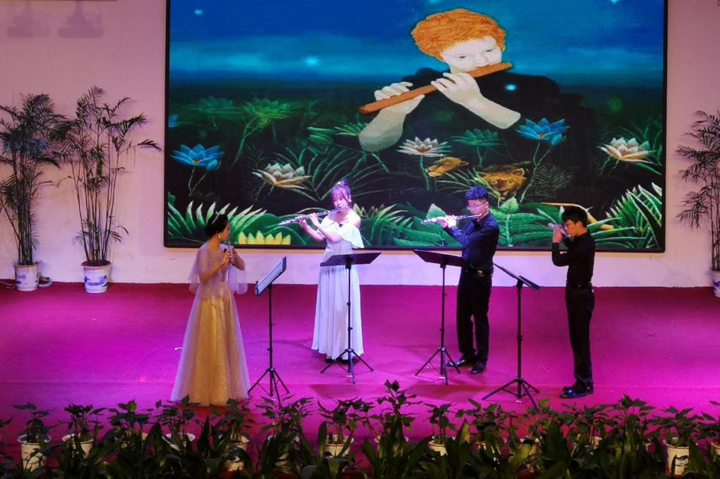 此次演出的乐器为钢琴、长笛。在《动物狂欢节》的双钢琴演奏中,独特的钢琴艺术表演形式及两名演奏者的默契配合,向观众呈现了不一样的艺术表现力。《阳光灿烂照天山》、《卡门主题幻想曲》这两首长笛协奏曲清亮悠远,带给大家独一无二的感受。在一系列精彩演出之后,最后一首长笛四重奏《魔笛》演奏结束,本次音乐会落下帷幕。音乐学专业学生精彩的演出赢得了在场观众的热烈掌声。
