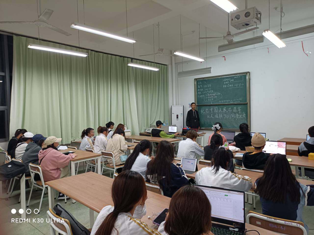 10月23日上午,纪念中国人民志愿军抗美援朝出国作战70周年大会在京隆重举行,习近平总书记出席大会并发表了重要讲话。会上,习近平总书记指出,伟大抗美援朝精神是弥足珍贵的精神财富。为向革命先烈致敬,加快建设我国军事强国伟大事业,深入学习贯彻习近平总书记重要讲话精神,人文与艺术学院于各班级发起了组织观看纪念中国人民志愿军抗美援朝出国作战70周年大会。