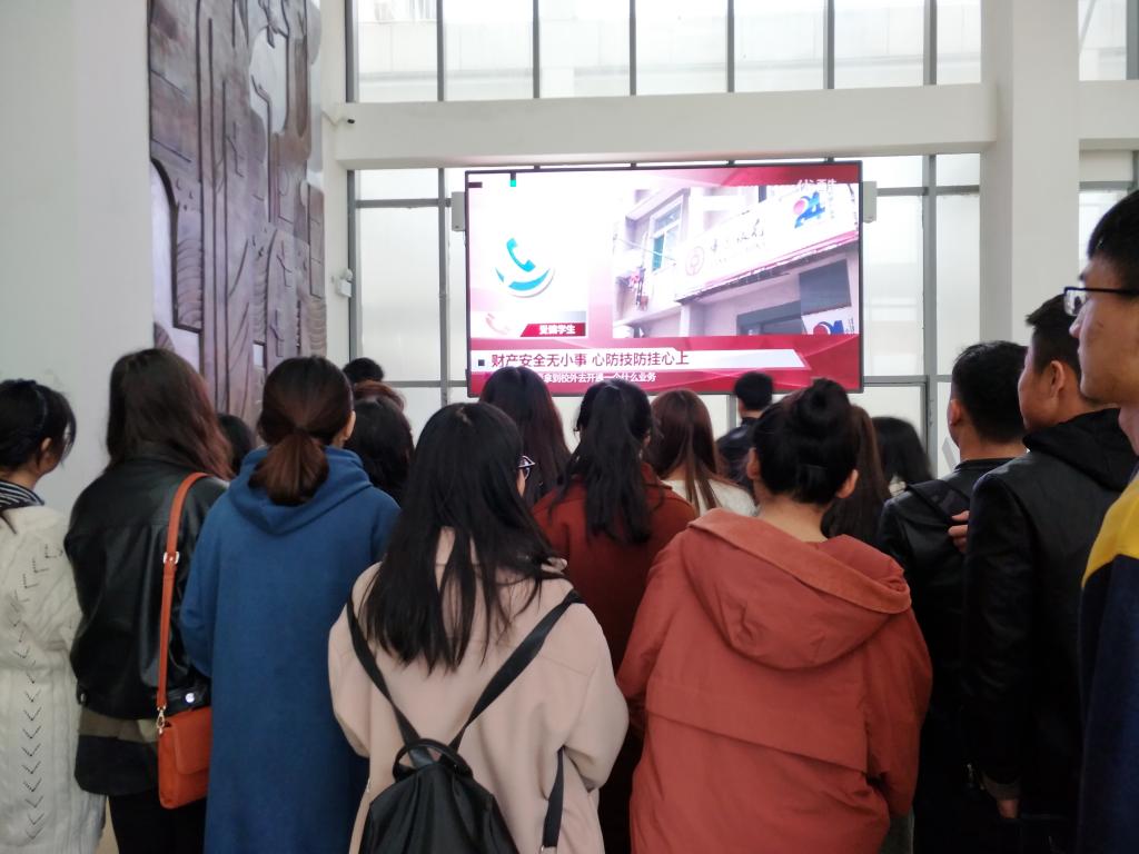 在艺术楼大厅的电子大屏幕上,播放着关于网络诈骗的种种事例,不久便吸引了许多过往的同学驻足观看。来自院团委学生会的干事付嘉奇现场为同学们讲解关于网络诈骗的事例,并呼吁同学们要增强防范意识,提升自身的道德修养和自我约束,避免落入网络诈骗的圈套。