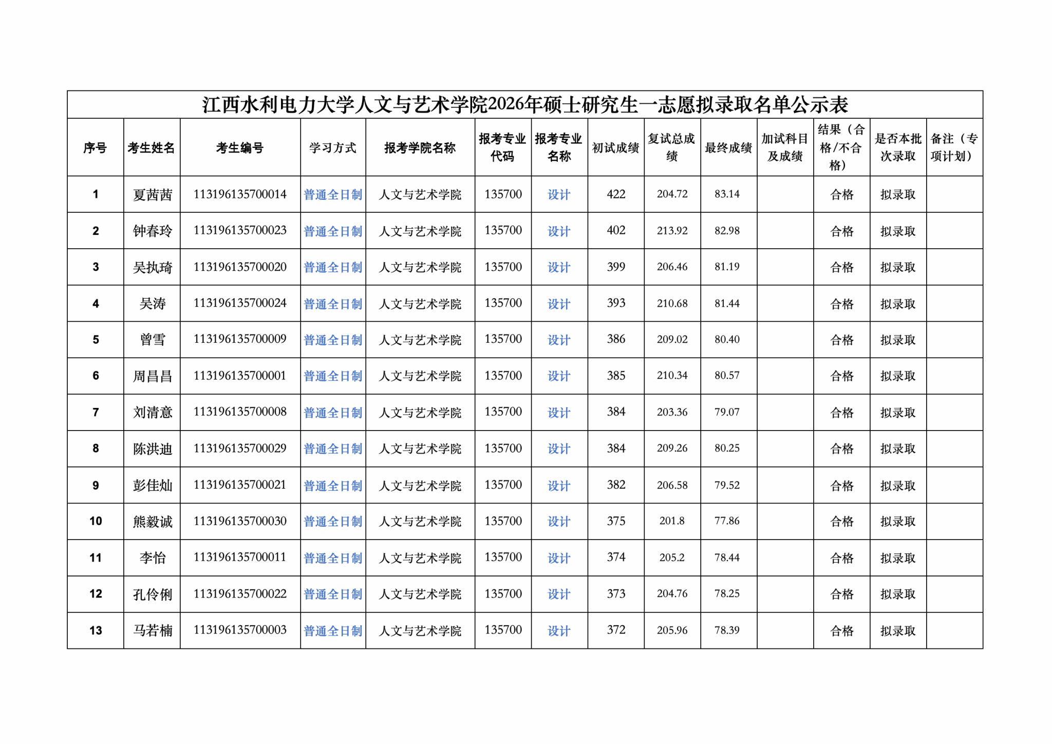 江西水利电力大学人文与艺术学院2026年硕士研究生拟录取公示