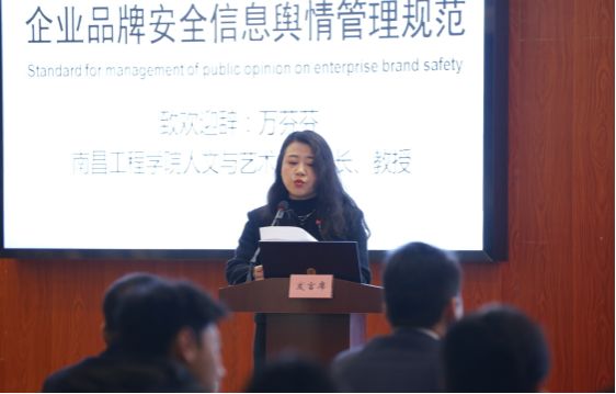 12月27日,由我院参与起草的全国商报联合会《企业品牌安全信息舆情管理规范》团体标准,在我校悦岸酒店四楼会议厅正式发布。全国商报联合会权益保护工作委员会主任黄柱,南昌工程学院人文与艺术学院党委书记张朝霞、院长万芬芬,专家代表朱志宁教授,起草人代表张兰副教授,来自全国各地的起草组成员和起草单位代表,以及我院师生近百人参加。发布会由我院新闻传播学教研室主任张记刚主持。