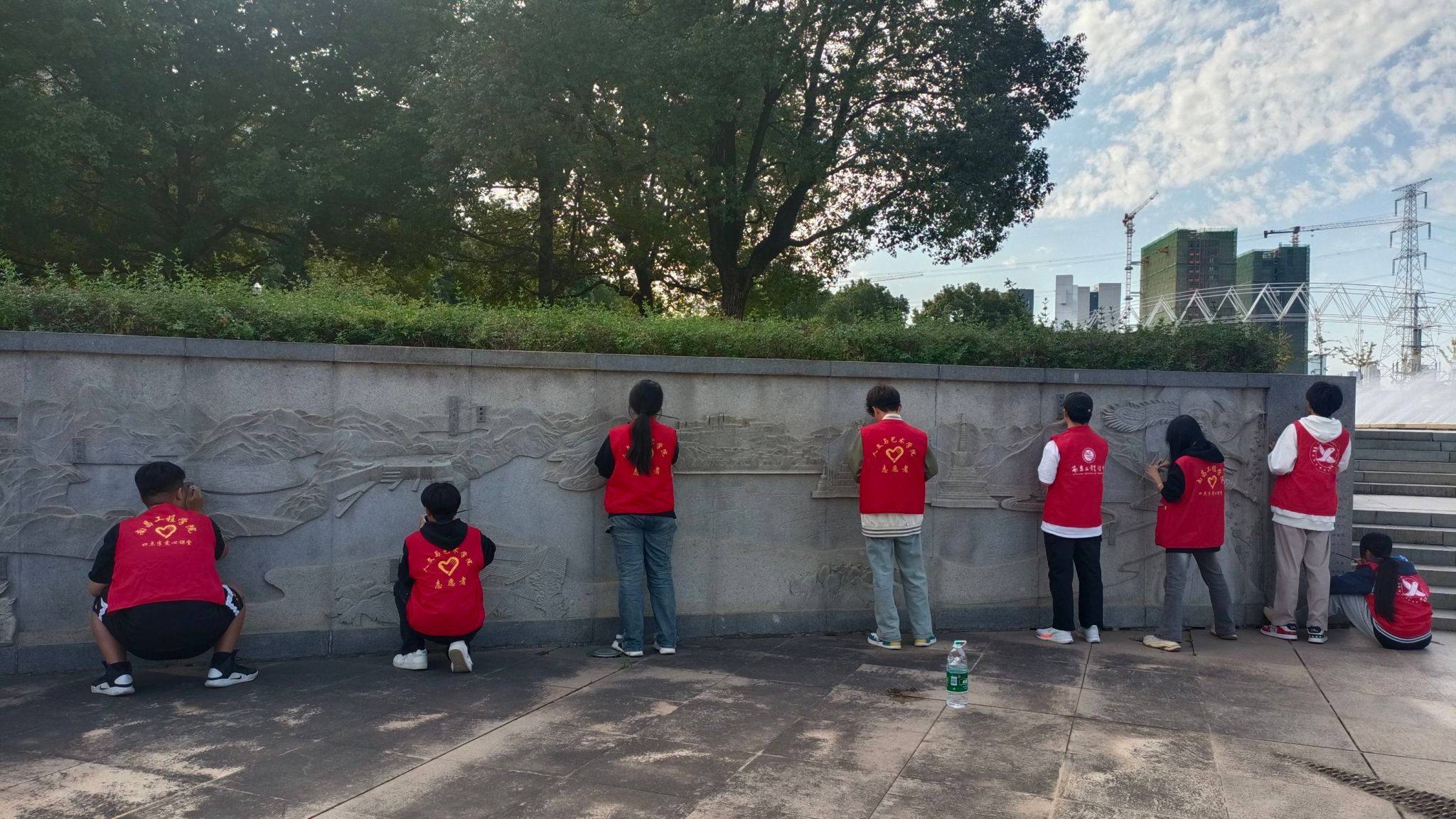 下午两点,志愿者们已全部在西大门指定地点集合,并分配绘画工具,展开修缮水文化长廊的志愿服务活动。身穿红色马甲的志愿者们一丝不苟、认认真真,拿着勾线笔细致地为长廊填补因历经风雨而褪去的色彩,展示了新时代青年学子服务校园的热情,他们忙碌的身影,形成了一道靓丽的风景线。