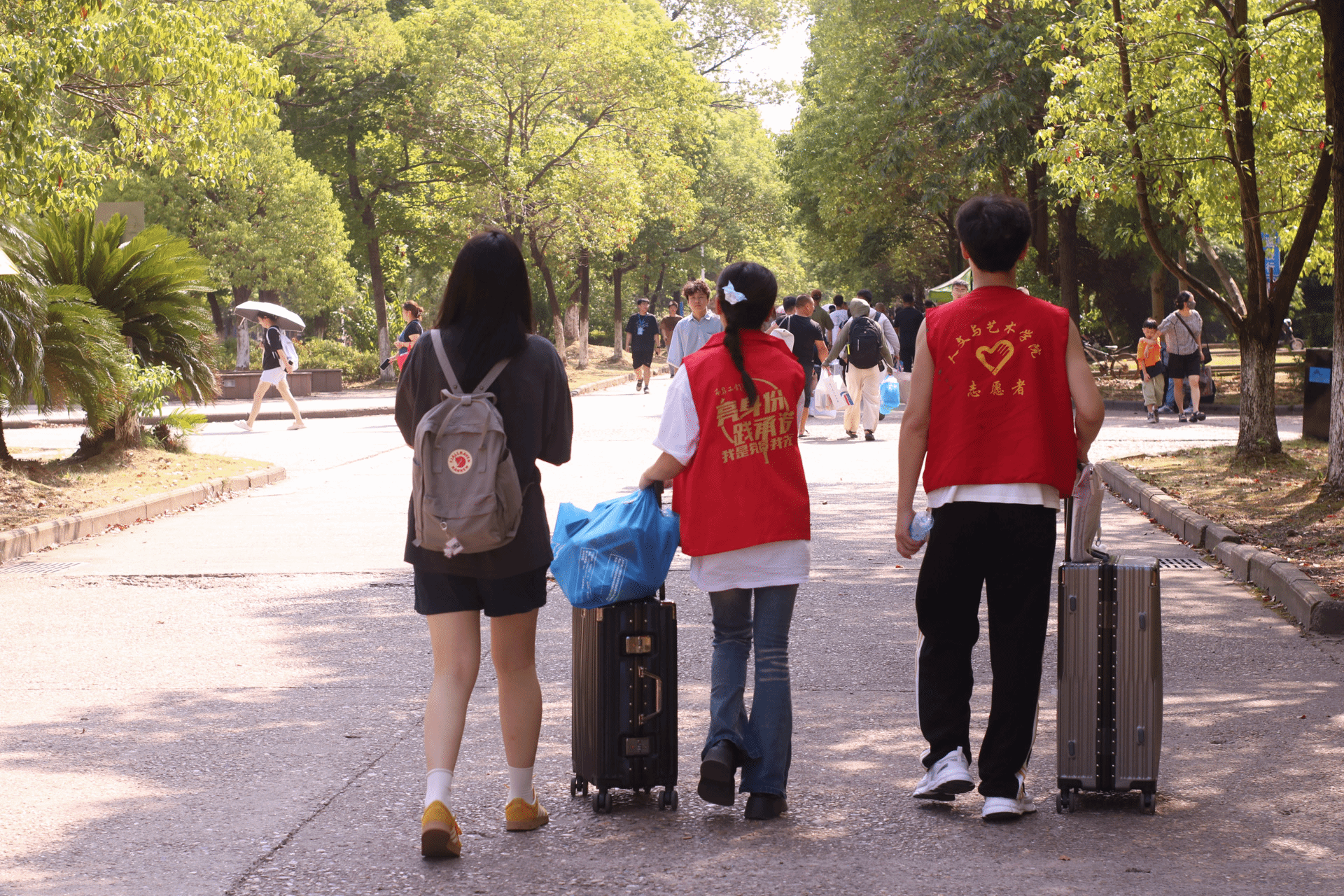 9月5日,我院的迎新工作正式拉开帷幕。志愿者们身着统一的红色马甲,手持欢迎横幅站在迎新点,用灿烂的笑容迎接每一位新生的到来。在迎新点,他们主动上前,热情地帮助新生搬运行李,减少新生的负担,让他们能够更加轻松地入住宿舍。在报到处,志愿者们负责协助新生完成注册报到流程,包括核对个人信息、发放宿舍钥匙、领取校园卡等,确保新生能够顺利完成入学手续。在新生们对新环境充满好奇和疑问时,志愿者们耐心地解答新生关于课程、社团、校园生活等方面的问题,帮助他们快速适应大学生活。志愿者们不仅在迎新现场忙碌,还积极参与了学院组织的一系列迎新活动。艺术市集等活动的开展让新生们在第一时间感受到学院浓厚的人文氛围和艺术气息。