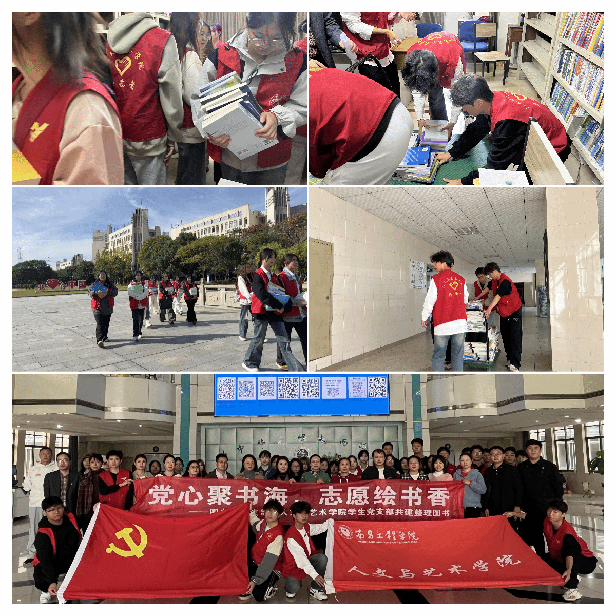 近日,人文与艺术学院第二学生党支部联合校图书馆党支部组织开展了“党心聚书海,志愿绘书香”的图书整理志愿服务活动。旨在通过志愿服务活动,激发学生党员对文化传承的责任感和使命感,为图书馆营造一个更加整洁、有序的阅读环境,推动书香校园建设。