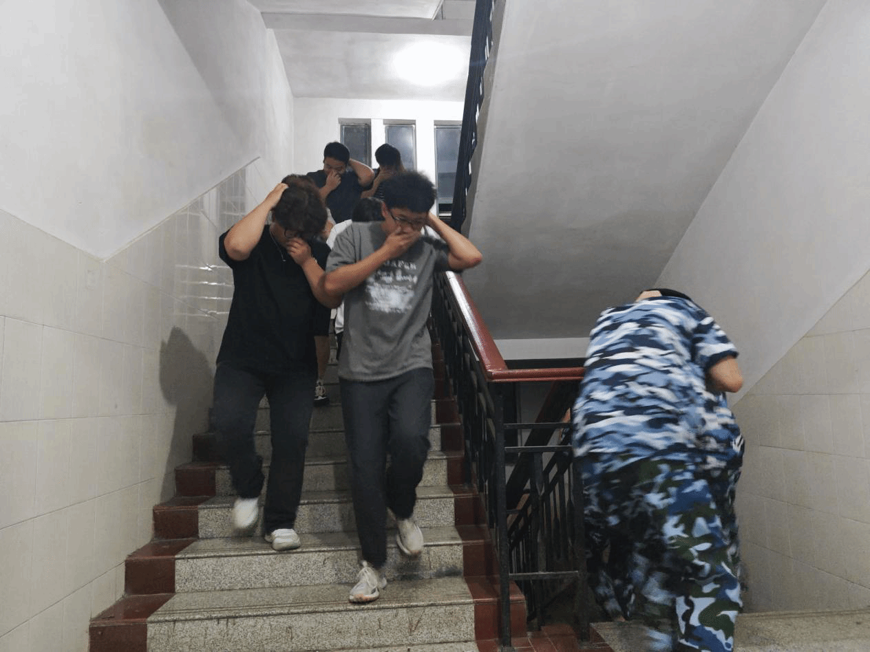 演练正式开始,模拟火灾警报信号准时发出。宿舍内学生迅速响应,严格按照应急疏散规范,采取“掩住口鼻、弯腰低姿、手护头部”的防护姿势,沿指定疏散路线快速有序下楼,整个疏散过程井然有序。全体人员顺利撤离至一楼大厅安全区域,工作人员随即开展消防知识教学,详细讲解并示范灭火器的使用步骤与注意事项,并普及了火灾报警流程、自救互救等应急方法。
